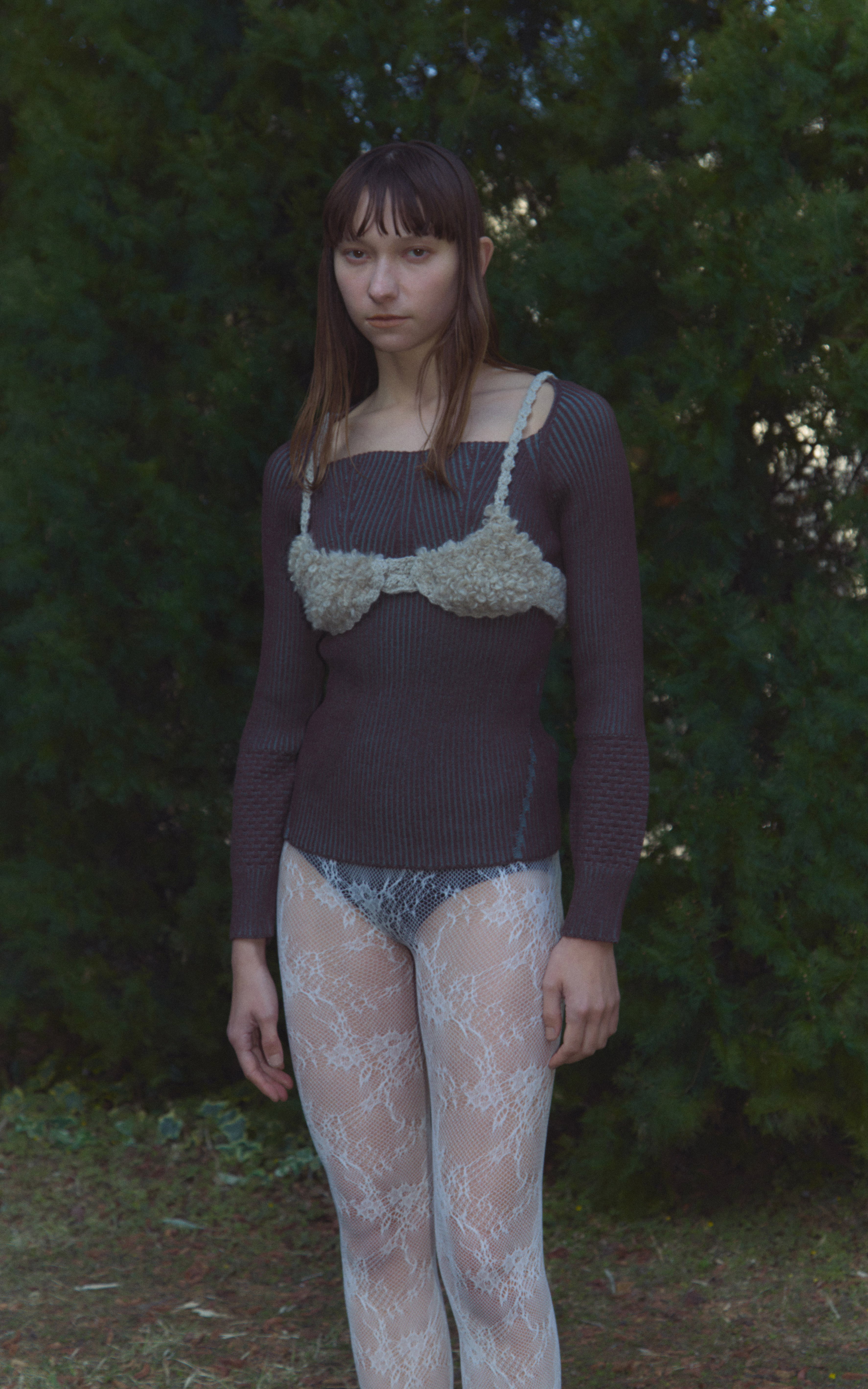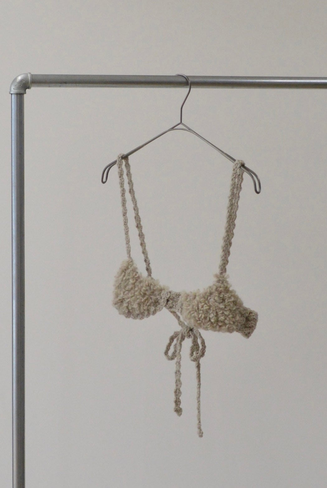 カップはループヤーンを棒針で、ジョイント部分とコードはクロシェ編みで仕上げたニットブラ。