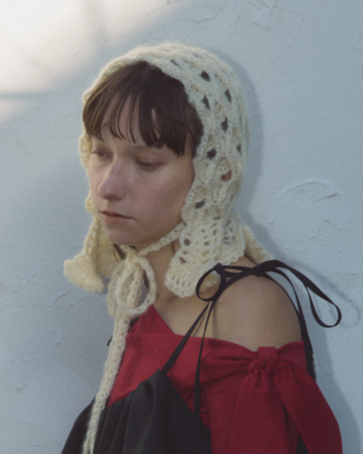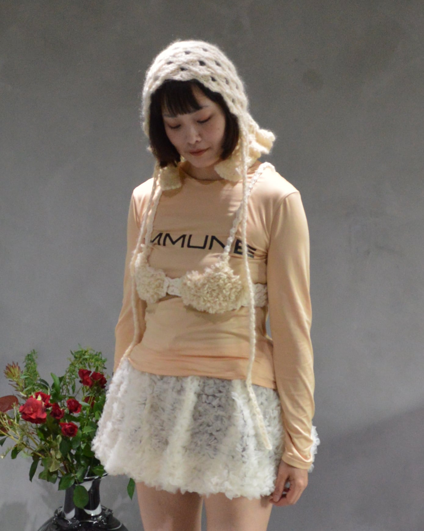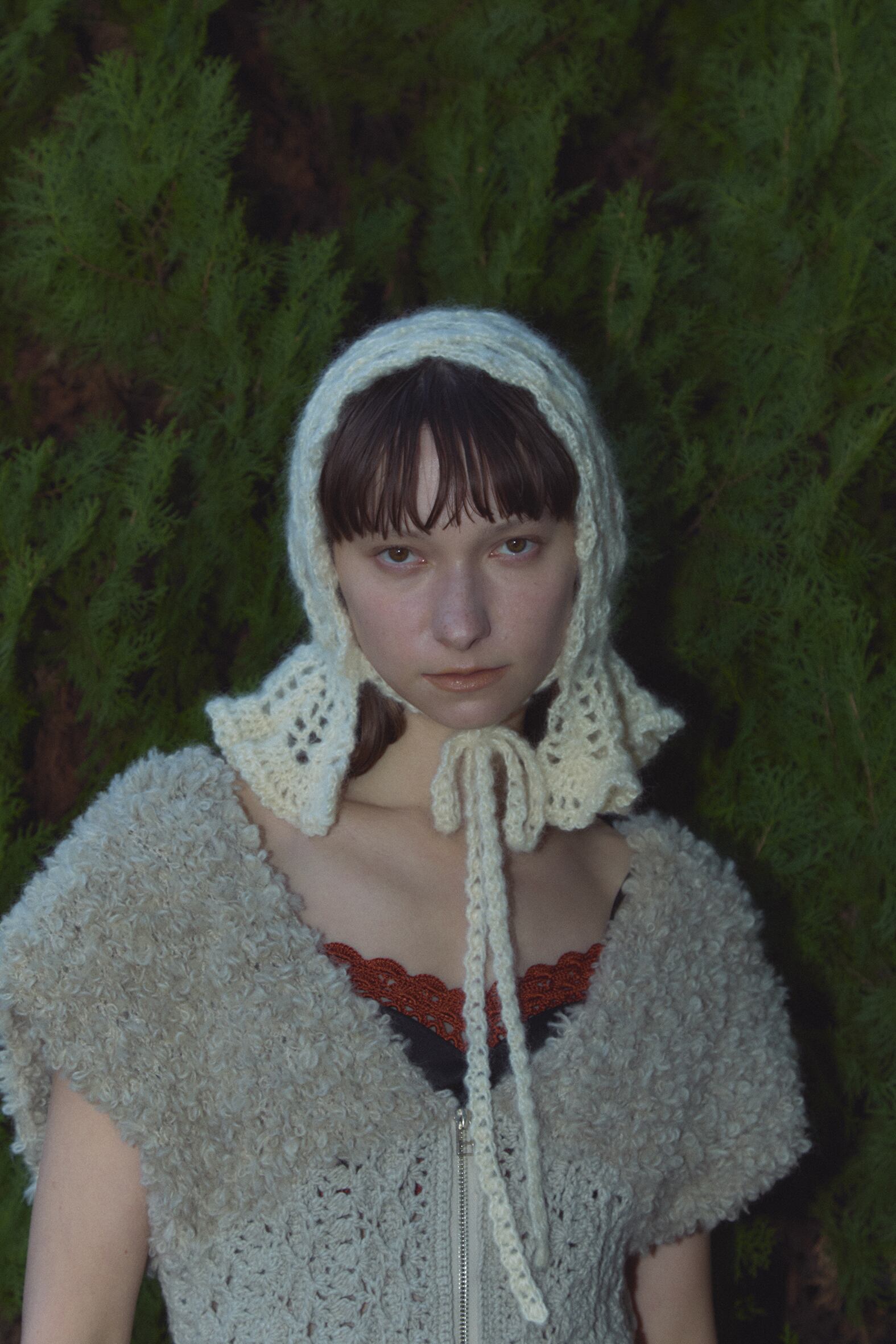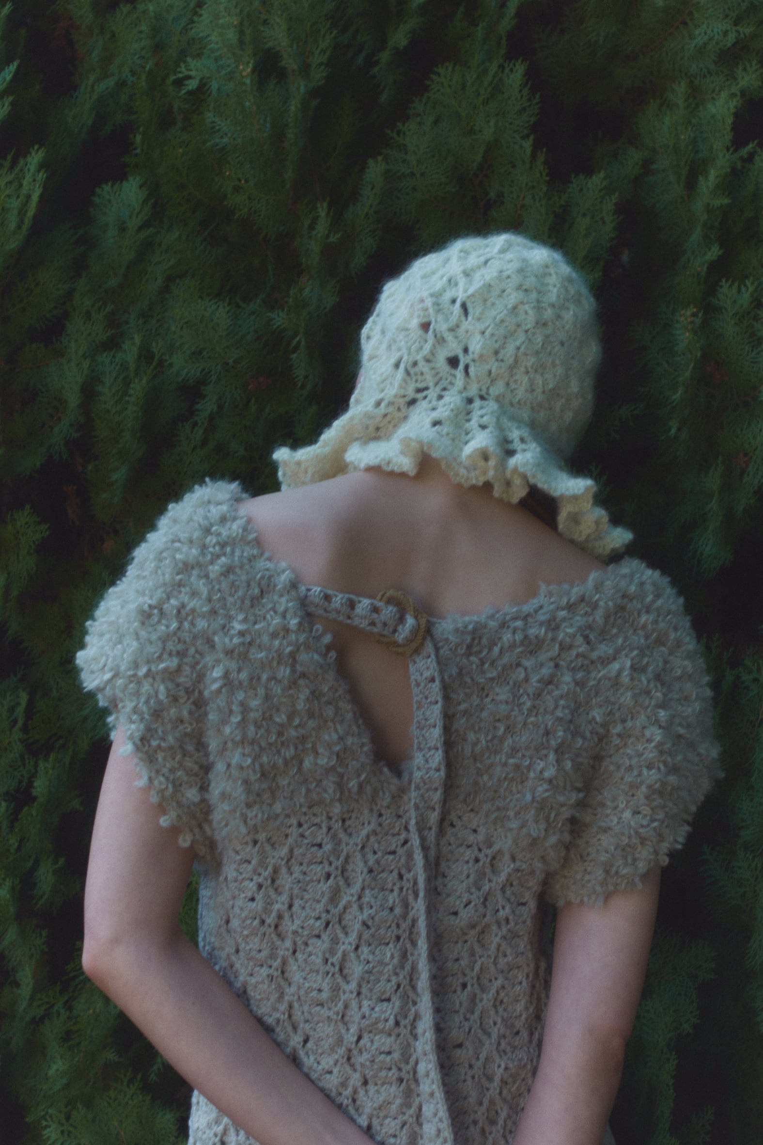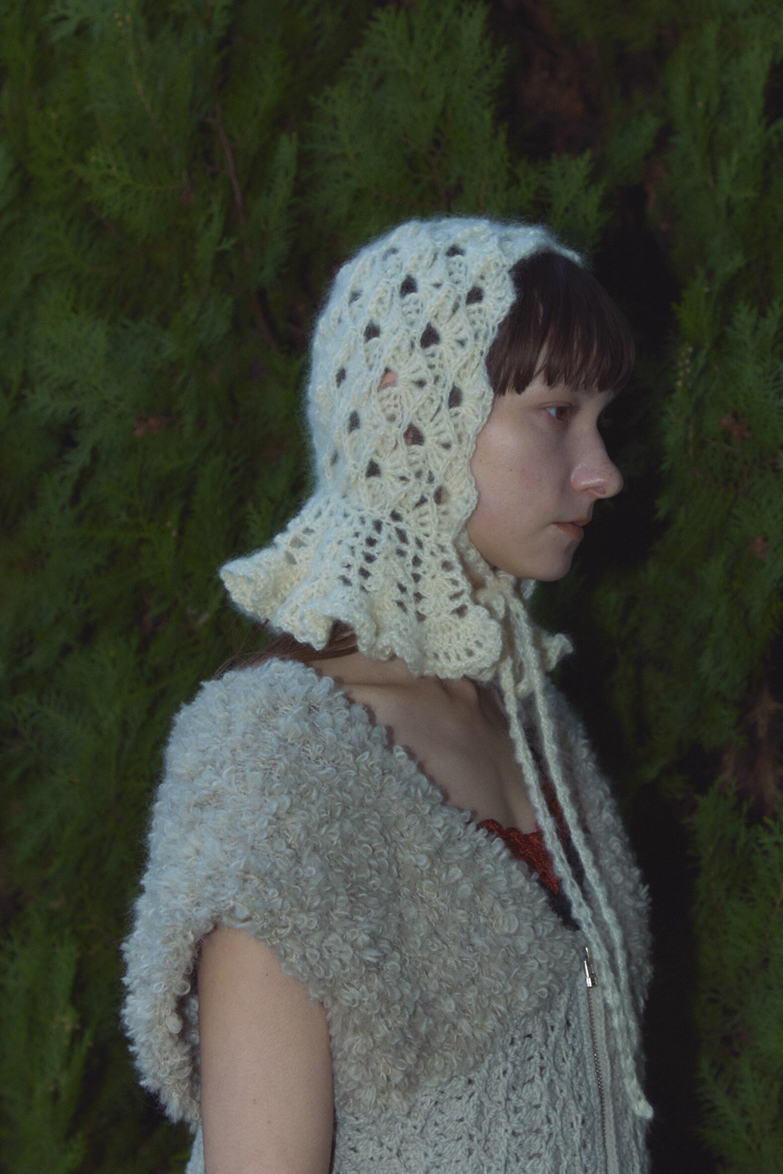 クロシェ編みで編まれたボンネットタイプのニットキャップ。 裾側のフリルパーツがポイントです。 キッドモヘヤのふわふわの糸で、全て手作業で編まれています。 KID MOHAIR-55% NYLON-30% WOOL-15% 306-NT-011