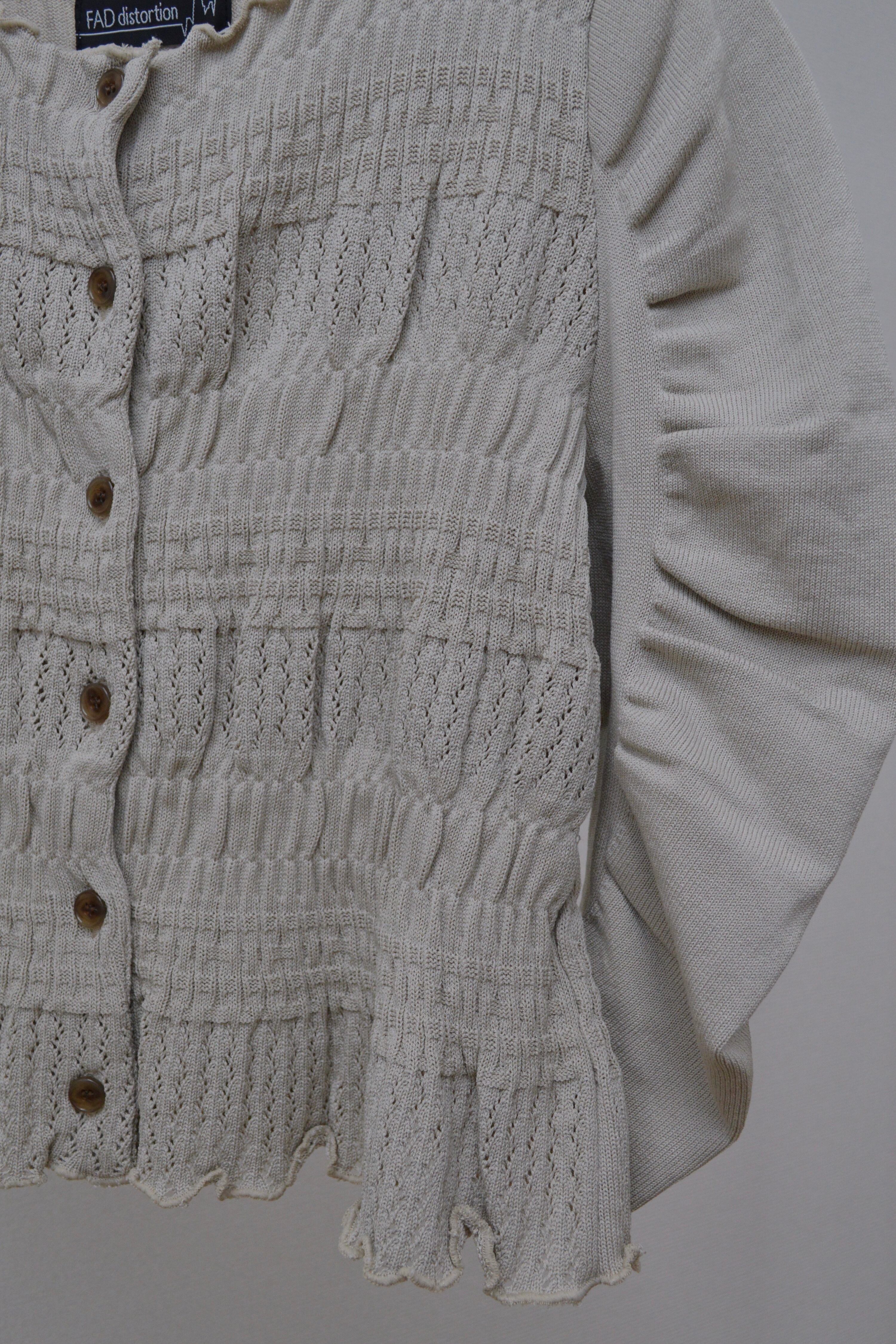 カーブのついた袖が着用することでギャザー感の出る、デザインカーディガン。