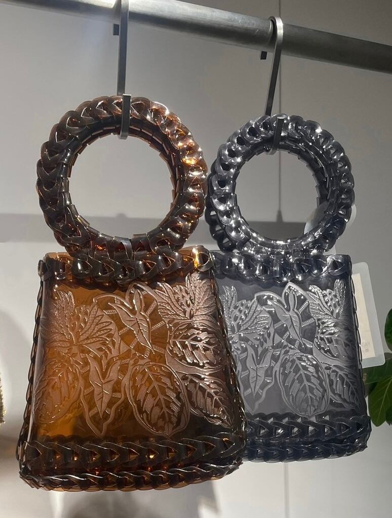 特殊加工でクリア素材にエンボスの柄を入れ、ニットの編み目の形をイメージしたタブパーツで手作業で1点1点編み上げています。
